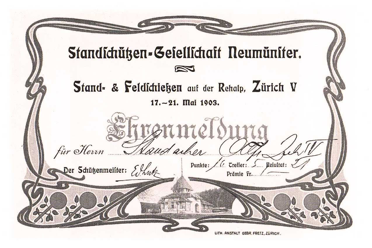 Die Gewehrsektion errang schon bald nach der Gründung gute Erfolge. So erreichte sie nacheinander an den Eidgenössischen Schützenfesten von 1907 (Zürich), von 1910 (Bern) und von 1924 (Aarau) im Sektionswettkampf den ersten Rang, wozu ihr der Stadtrat von Zürich offiziell gratuliert hat. Auch auf internationalem Boden war sie in dieser frühen Zeit an vielen Wettkämpfen erfolgreich. Insbesondere nach dem Gewinn des internationalen Matches in Rom (1911) wurde ihr zuhause ein begeisterter Empfang zuteil. An der Schweizerischen Gruppenmeisterschaft, die seit 1950 durchgeführt wird, nahmen wir Standschützen über 25 mal mit insgesamt 5 Siegen teil.